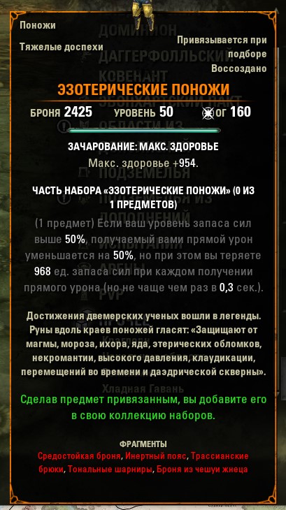 Основные характеристики эзотерических поножей Тесо Зацепки